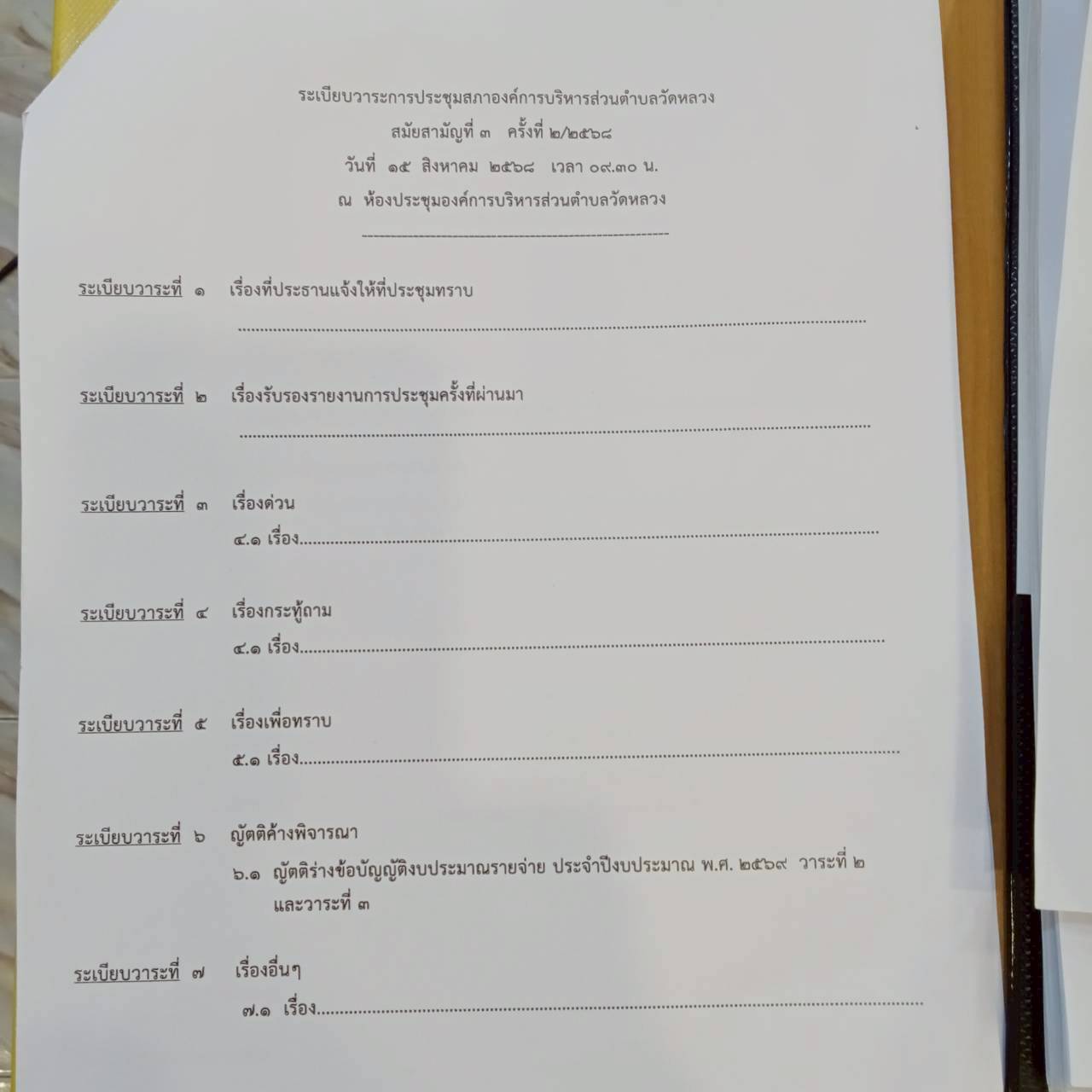 15 สิงหาคม 2568 เวลา 09.00 น. การประชุมสภาฯ. องค์การบริหารส่วนตำบลวัดหลวง สมัยสามัญ สมัยที่ 3 ประจำปี พ.ศ.2568 เพื่อพิจารณาร่างข้อบัญญัติงบประมาณรายจ่าย ประจำปี 2569 และดำเนินการตามหน้าที่ตามที่กฎหมายกำหนด